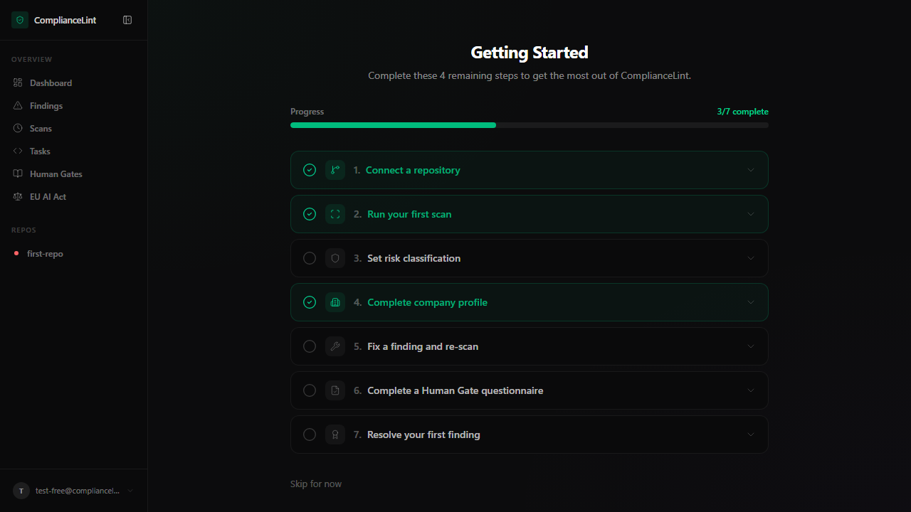 After sign-up, ComplianceLint redirects you to a 7-step checklist until you skip or complete enough steps. The page is more than a tour — completion of specific steps unlocks features (e.g. the Profiling Wizard banner only appears AFTER step 3). Knowing what each step gates helps you decide which to prioritise vs. skip.