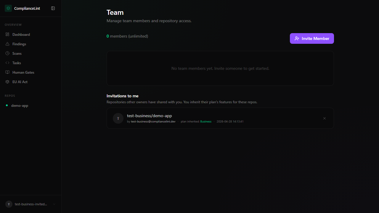 Compliance is rarely a one-person job: an engineer scans, a compliance lead reviews, a counsel attests. ComplianceLint's invite flow lets the OWNER bring members onto specific repos without sharing API keys. Members inherit the OWNER's tier for that repo (so a Free member of a Pro owner's repo gets Pro features there), which keeps billing simple but means downgrade events have a blast radius across teams.