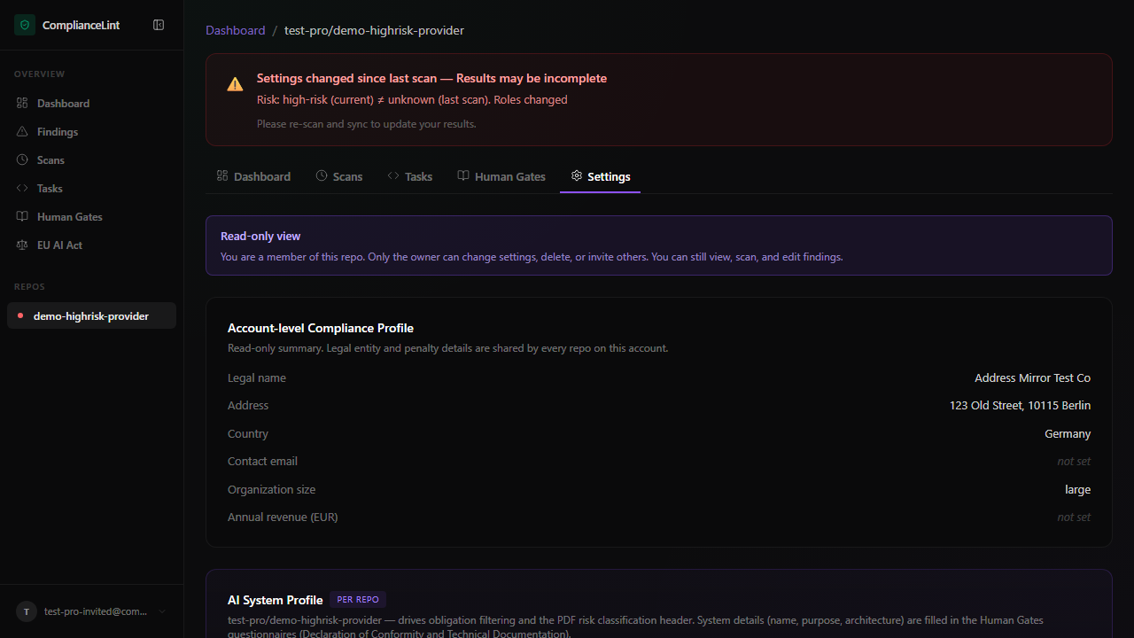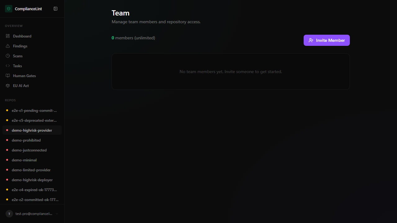 noreply@compliancelint.dev. If still missing, the OWNER can re-send from the Team page (Resend button on the pending-invite row). Also verify your account's email allowlist — corporate filters sometimes block first-contact from unknown SaaS senders. - Member can't fill a Human Gate questionnaire even though they have access — Human Gates Fill is gated by the OWNER's tier, not the member's. If the owner is Free or Starter, no one on the repo can fill — the dropzone shows "upgrade required". Owner needs Pro+ for the fill action to unlock for the whole team.
